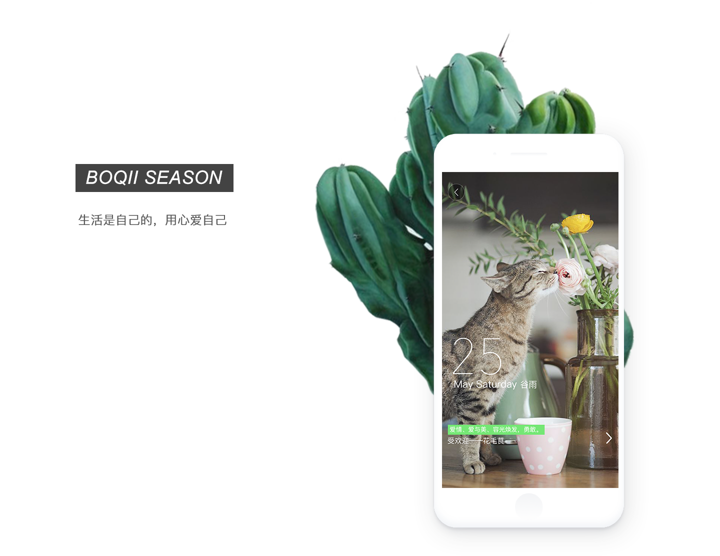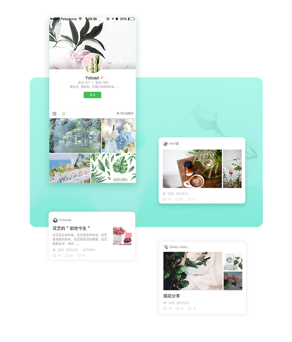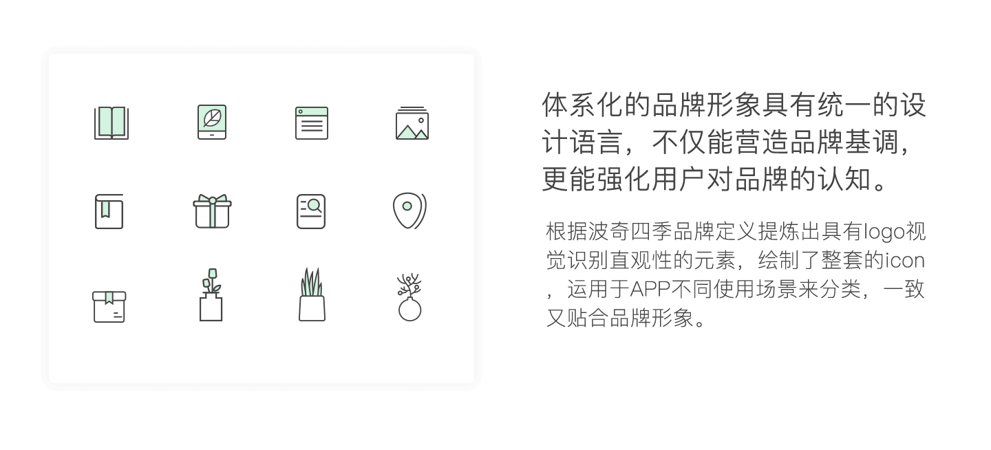 根据波奇四季的产品定位,选取绿色、黑色、白色为主色调,体现波奇四季的生活美学平台的定位,体现了品牌质感。使用扁平化设计,界面简洁,条理清晰;去除冗余信息对APP的主要信息的干扰。