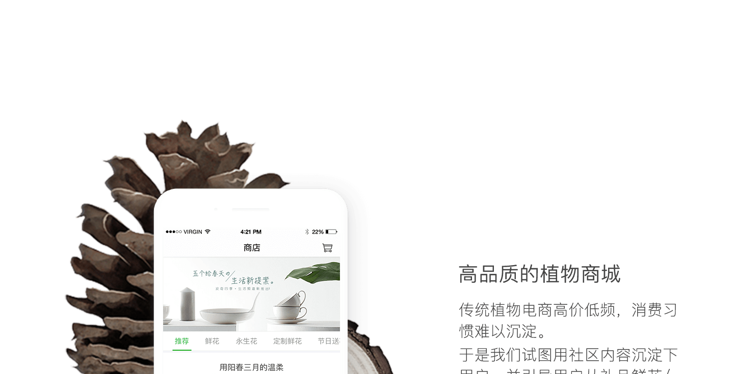 植物电商成本非常高,尤其在异地的物流配送上成本始终是一个难以解决的问题。因此我们初期以同城配送为主,一方面定位一线城市中高端人群,另一方面采用高性价比的植物组合搭配方式。同时辅以一些细分的场景切入市场(企业B端用户),在初期获得较好成效。