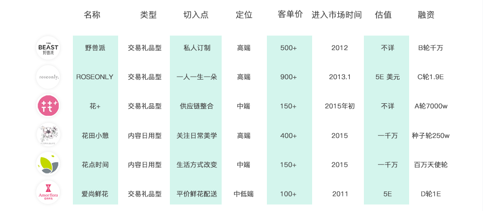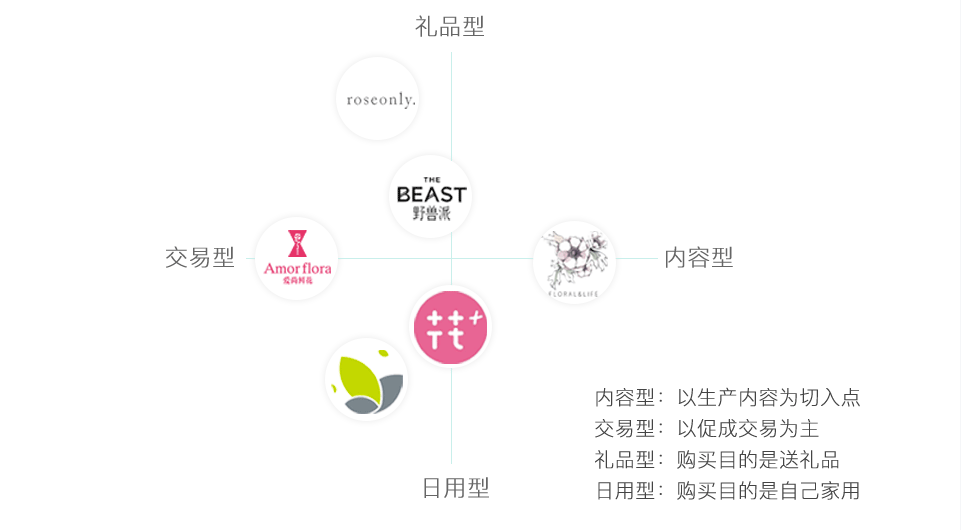 小结:市场上较大的鲜花电商类型主要集中在礼品交易型,而新参与到市场中来的(如花点时间/花田小憩)纷纷向日用内容型靠拢,而且日用交易型因为人群习惯还未成熟,目前没有商家进入。